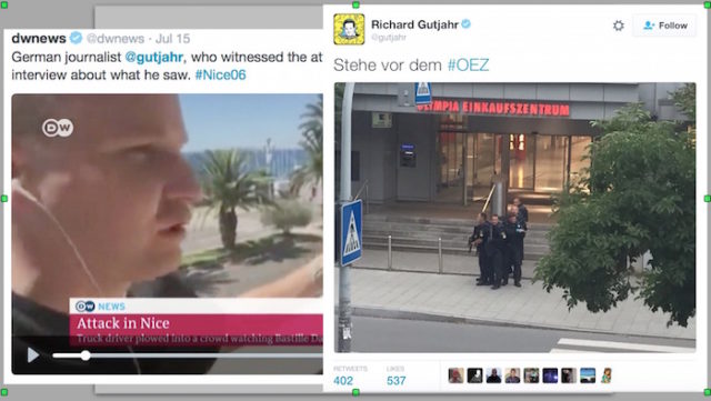 Německý novinář, Richard Gutjahr, který vyfotil v Nice kamion s atentátníkem z balkonu svého hotelu, protože byl náhodou tou dobou ve Francii, referoval i o atentátu v Mnichově, protože byl náhodou tou dobou u nákupního centra v Mnichově.