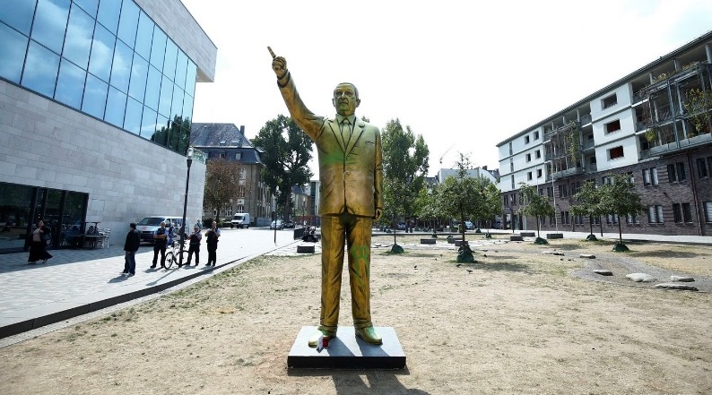 Ve Wiesbadenu se až do 2. září koná bienále na téma „špatné zprávy“ a Erdoganova zlatavá socha je jeho součástí. To ovšem místní nepochopili a obrovské dílo brzy vyvolalo poprask.Zatímco hrdí němečtí Turci si u svého vůdce fotili selfie, odpůrci prezidenta na něj sprejovali nadávky a další prostě jen nechápali, co skulptura na náměstí Německého sjednocení dělá. Policie podle stanice ZDF musela sochu chránit před naštvanými lidmi a řešila i rvačku několika Kurdů a Turků.