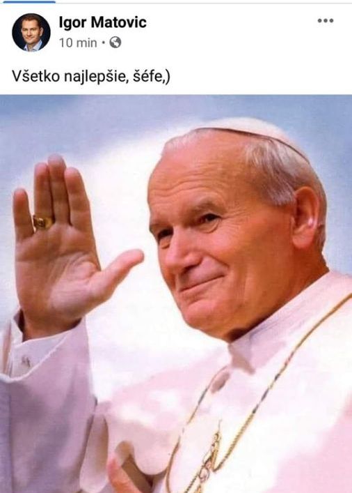 V pondelok si chcel na svojom fb účte pripomenúť 100. výročie narodenia Jána Pavla II. a tak uverejnil fotku podobizne Jána Pavla II. s typicky svojským prianím: “Všetko najlepšie, šéfe.” To, pochopiteľne, vyvolalo obrovskú vlnu pohoršenia a tak text Matovič rýchlo zmenil a napísal: “Všetko najlepšie, užívajte nebíčko.”