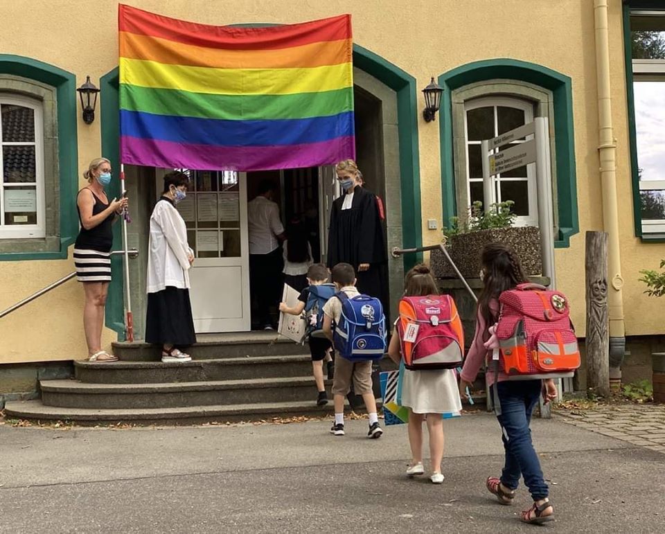 Není jasné, zda byla v ten den také vyfotografována vlajka. Tento obrázek se údajně objevil na Facebookové stránce protestantské církve v Moers 19. srpna – podle svědků byly komentáře většinou negativní a komentátoři byli šokováni kvůli indoktrinaci dětí. V odpoledních hodinách téhož dne autoři smazali obrázek. Píše portál Arcadi.