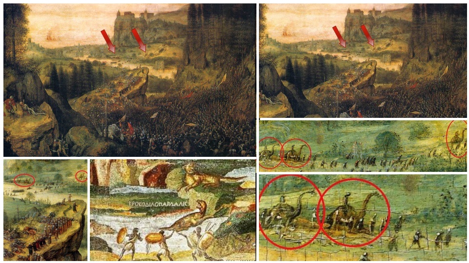 Obraz z roku 1562, který není považován za falešný. Jsou tu tři dinosauři a máme kolem sebe lidi.